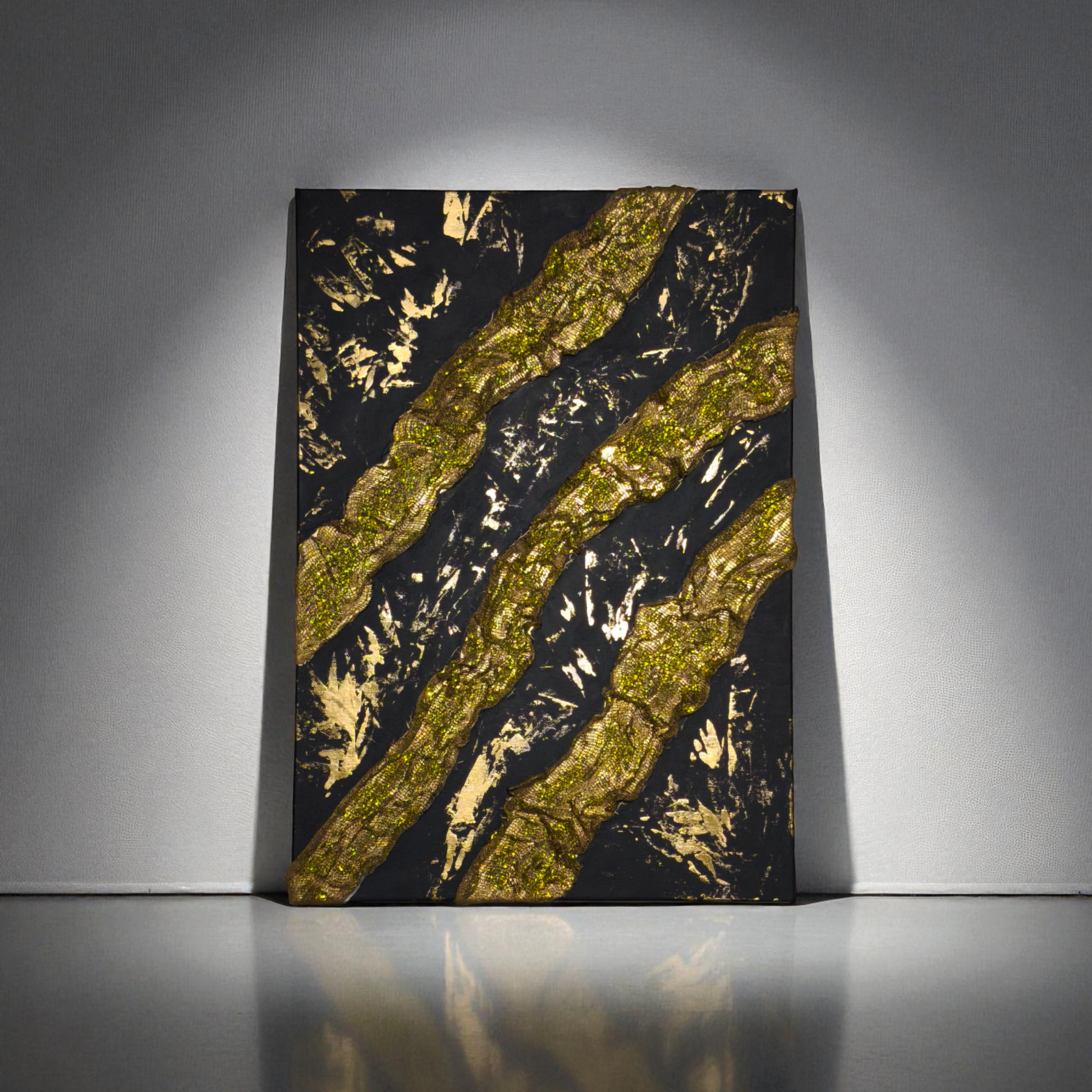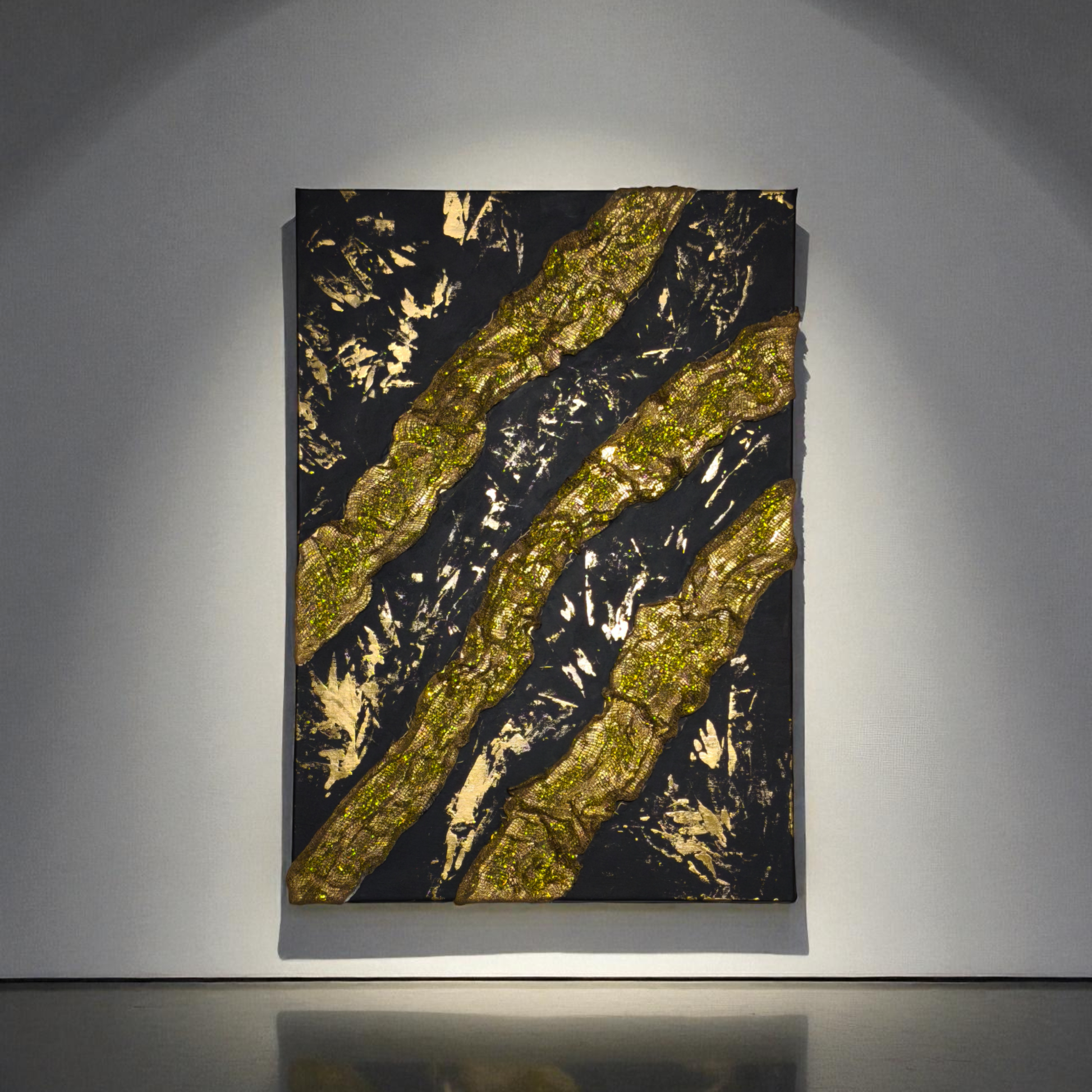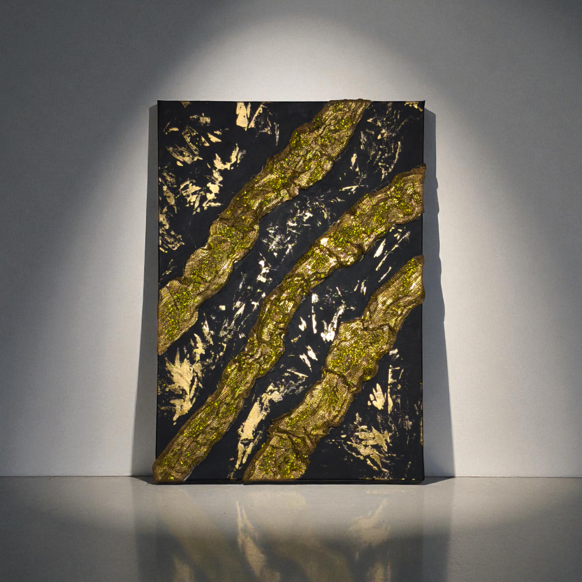 Tabloyu boydan boya kesen üç ana şerit, el ile hissedilebilir, yoğun dokulu ve ışıltılı bir kabartma tekniği ile hazırlanmıştır. Işık vurduğunda parıldayan bu detaylar, tabloya hareket katar.