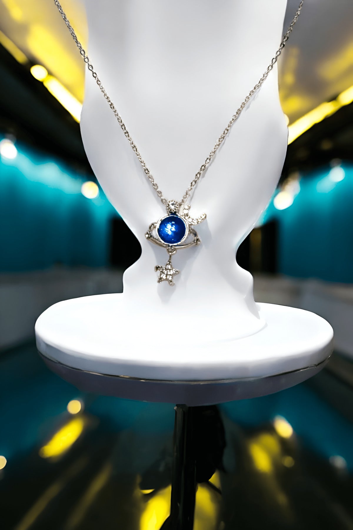 Mavi Küre Figürlü Kadın Çelik Kolye + Küpe