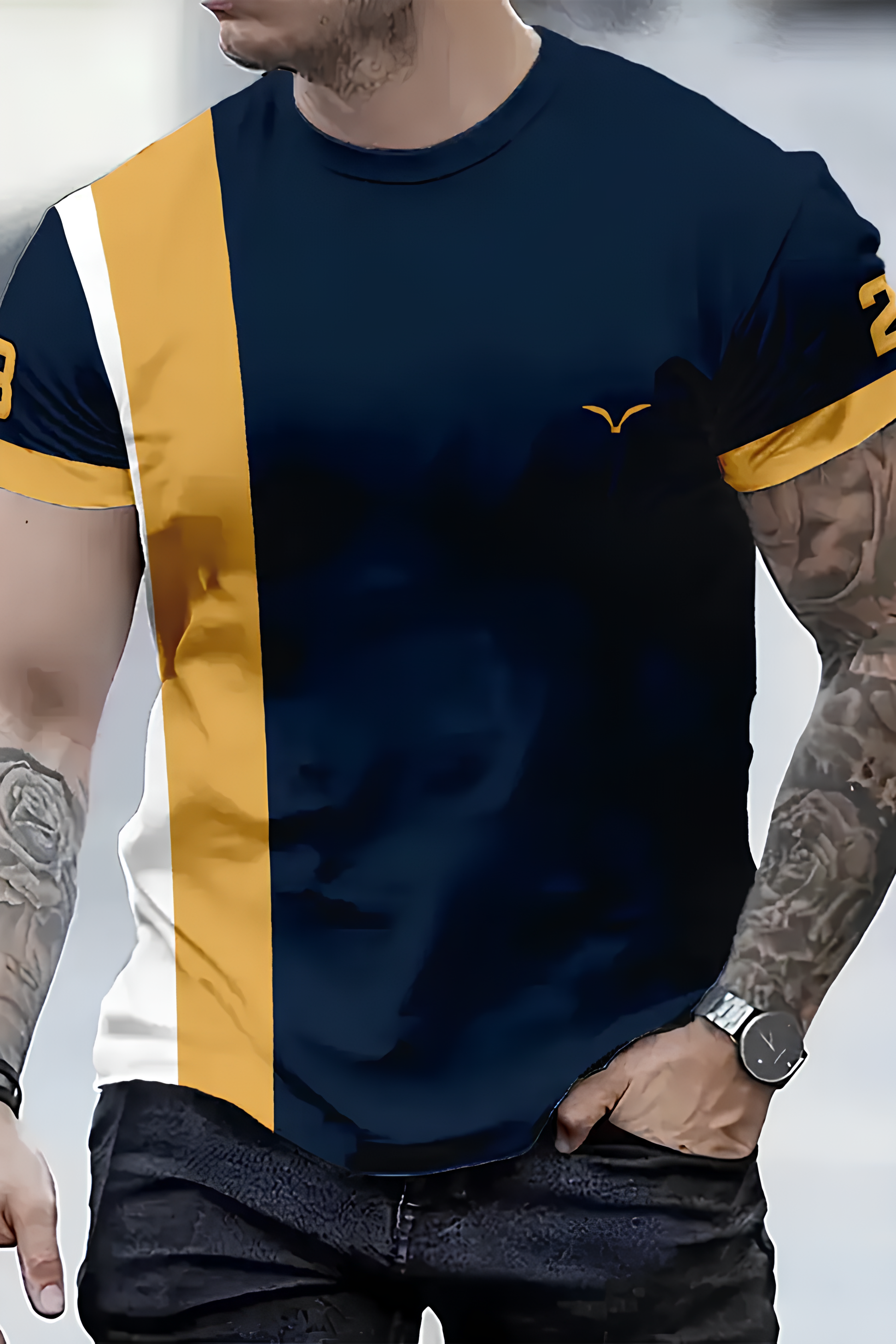 Erkek Dikey Sarı Desenli Mavi Tshirt