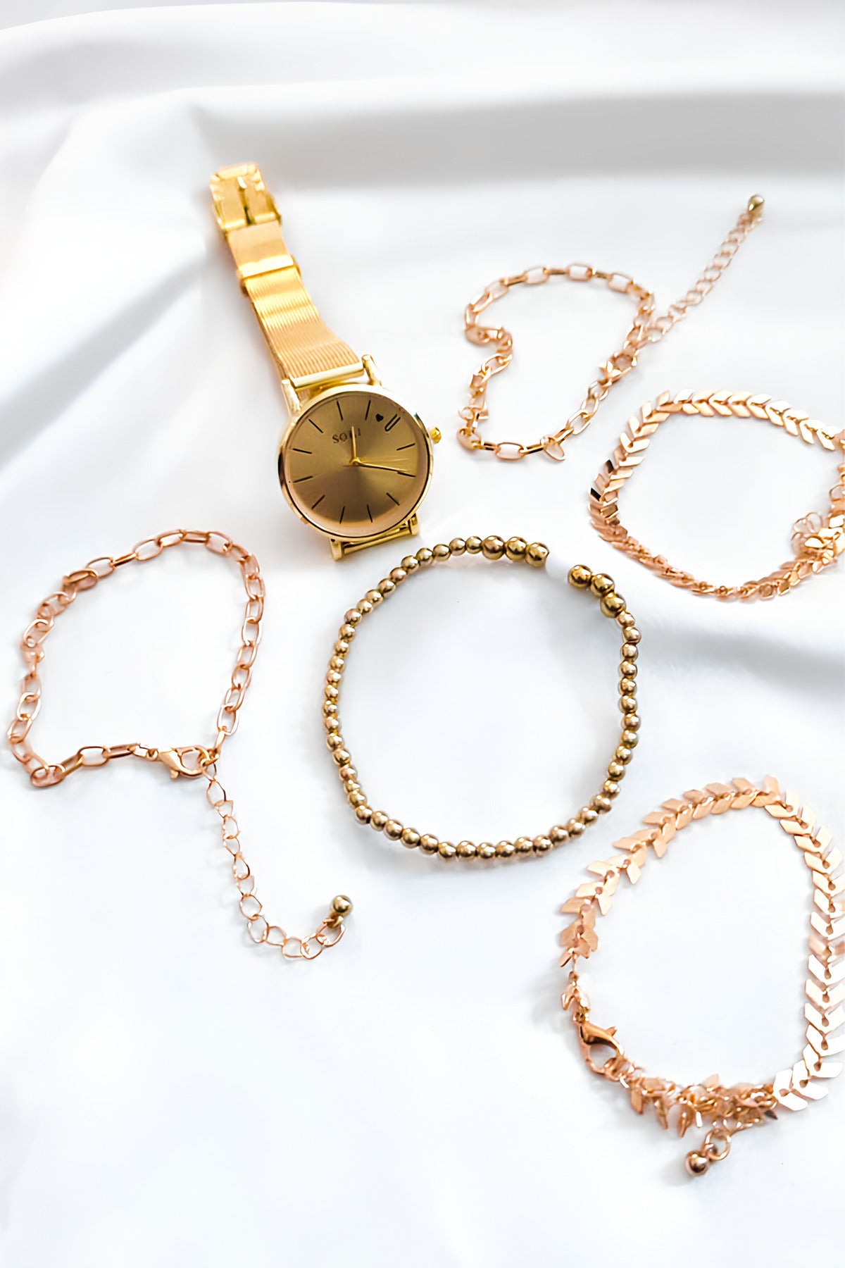 Altın Renk Parıltılı Kadın Kol Saati + Bileklik Tamamen Çelik
