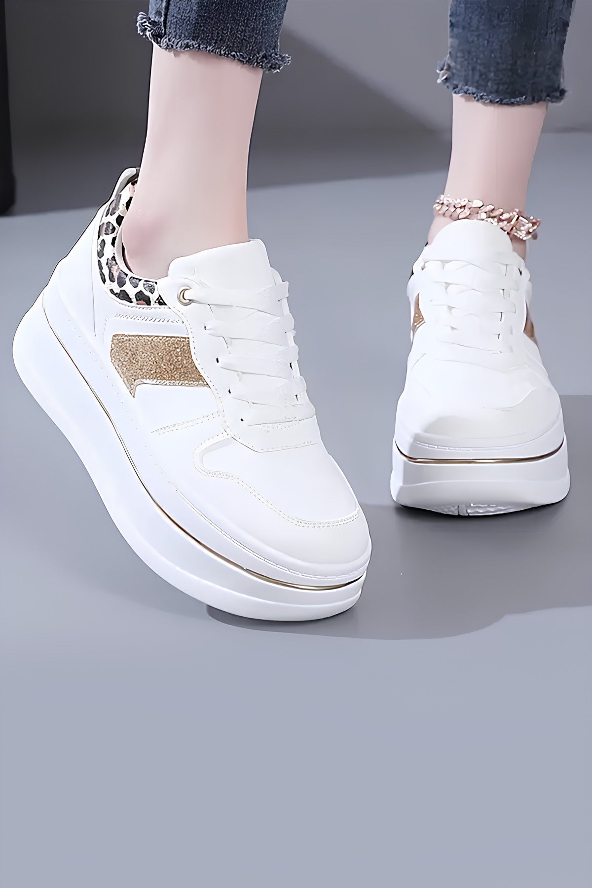 Beyaz Kalın Taban Kadın Spor Ayakkabı – Leopar ve Gold Detaylı Sneaker