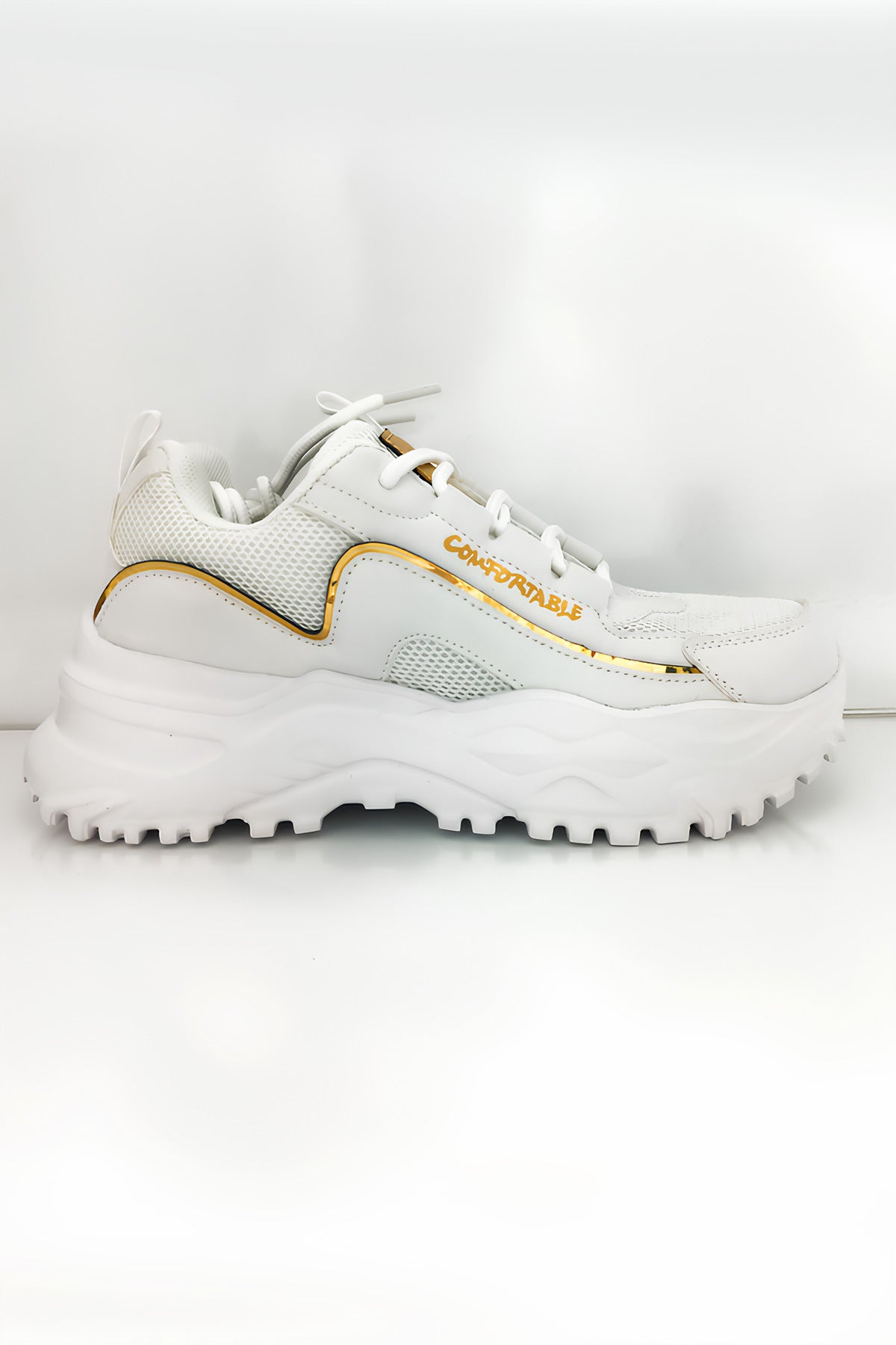 Beyaz Kalın Tabanlı Spor Ayakkabı – Altın Detaylı, Rahat ve Şık