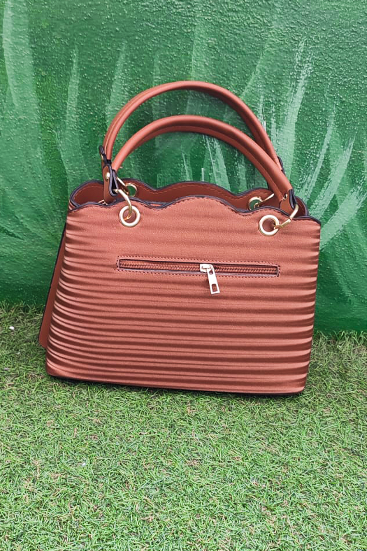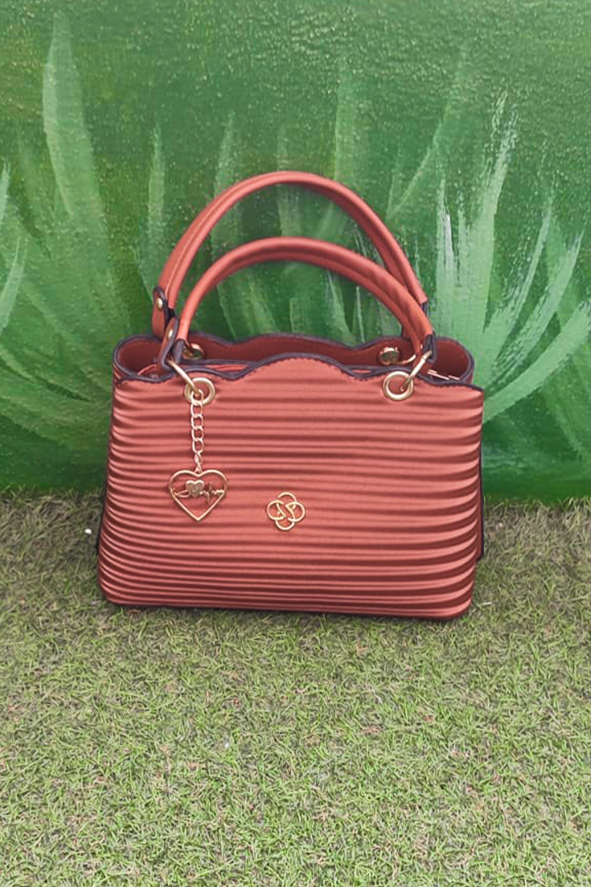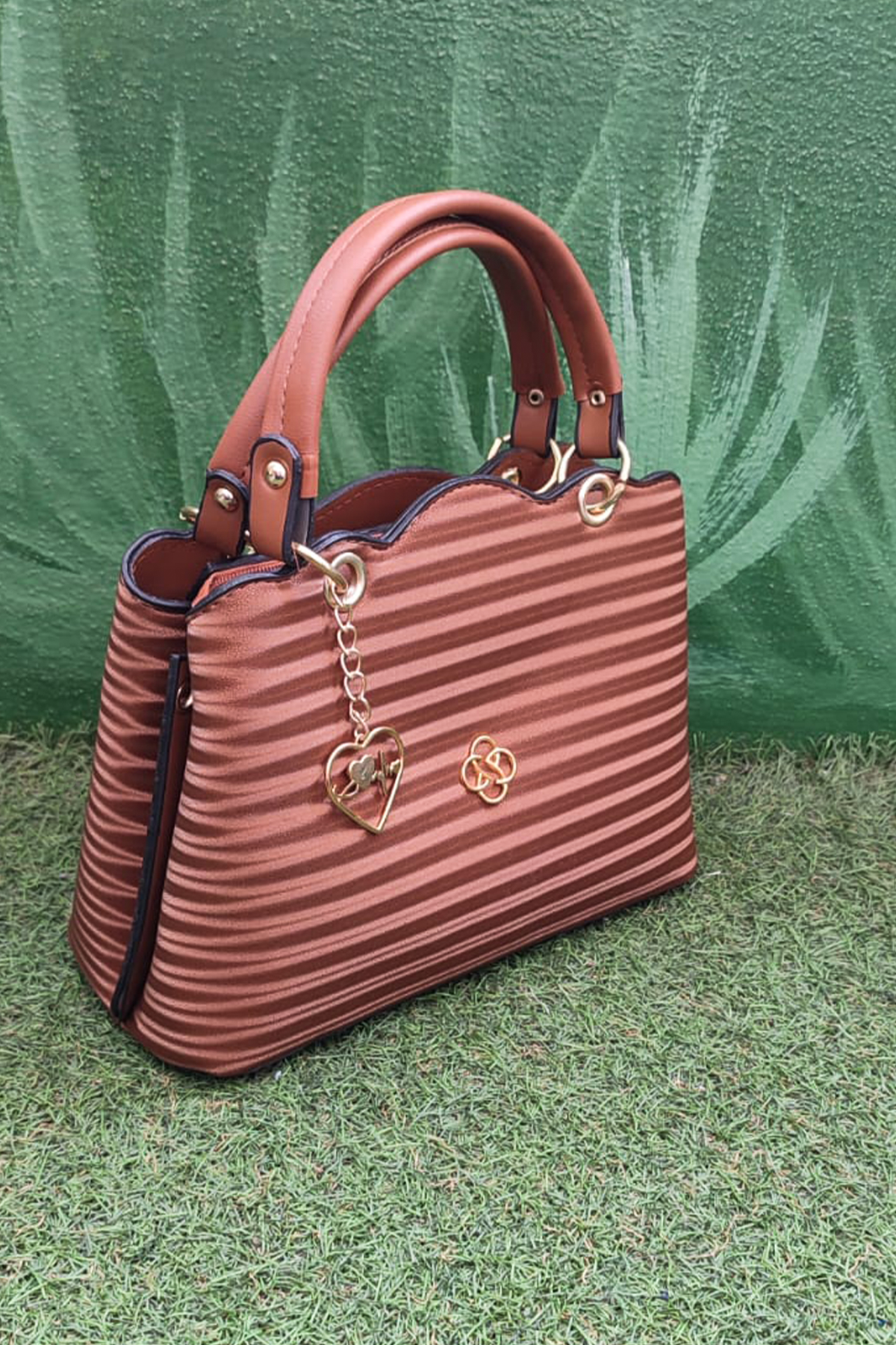 Modern Dalga Desenli Taba Renk Kadın El ve Omuz Çantası – Altın Kalp Aksesuarlı