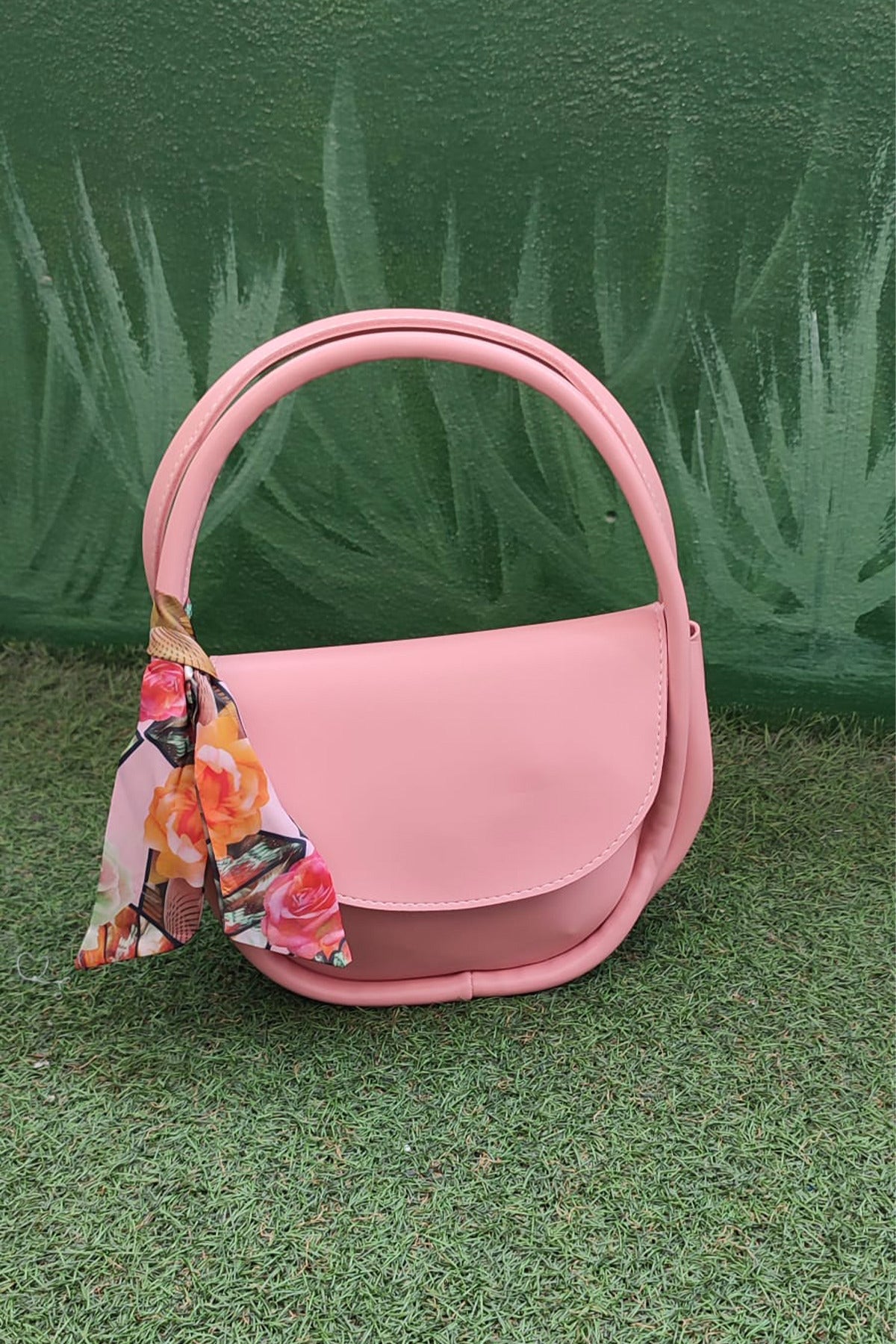 Yuvarlak Saplı Pudra Pembe Kadın Omuz Çantası – Fular Detaylı Şık El ve Günlük Çanta