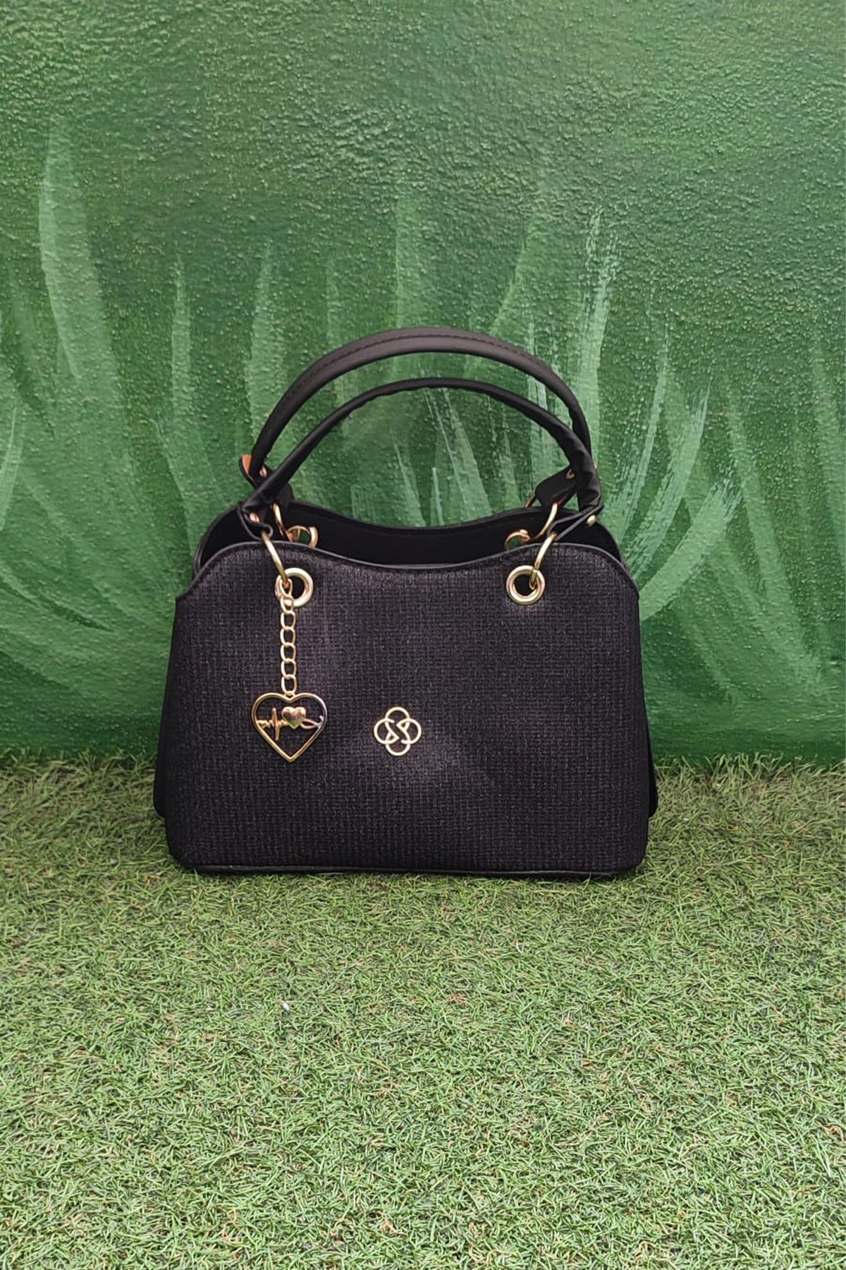 Siyah Kumaş Dokulu Kadın El ve Omuz Çantası – Altın Kalp Aksesuar Detaylı Şık Tasarım