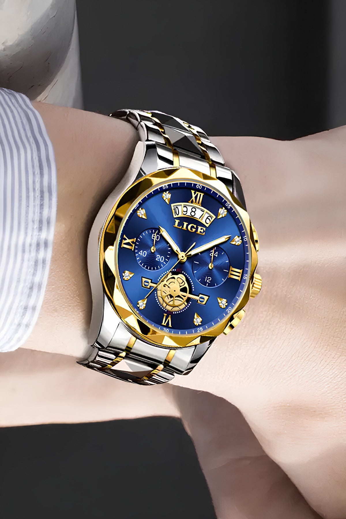 Mavi Kadranlı Paslanmaz Çelik Erkek Kol Saati İki Tonlu Altın Gümüş Tasarım