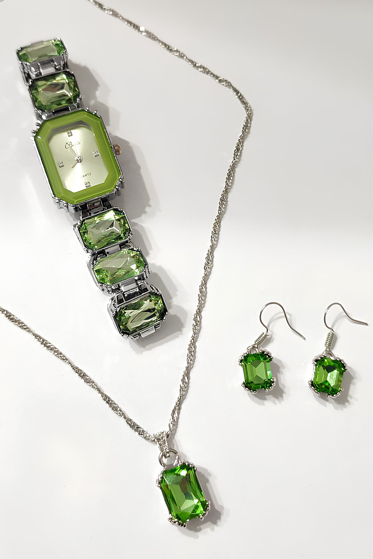 Zarif Çelik Yeşil Taşlı Takı Seti – Saat, Kolye ve Küpe Kombini