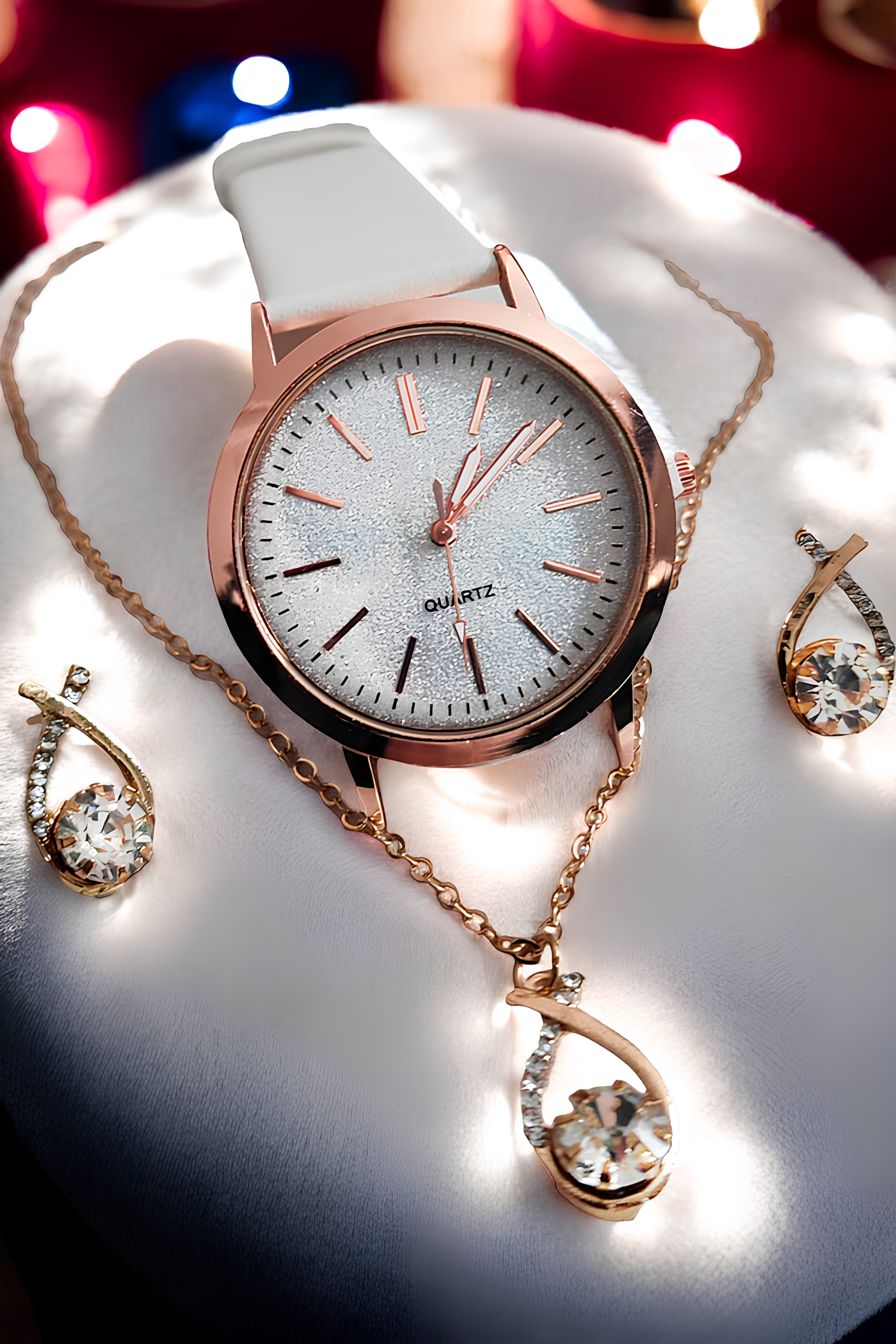 Parlak ve Zarif Kadın Takı Seti – Saat, Kolye ve Küpe