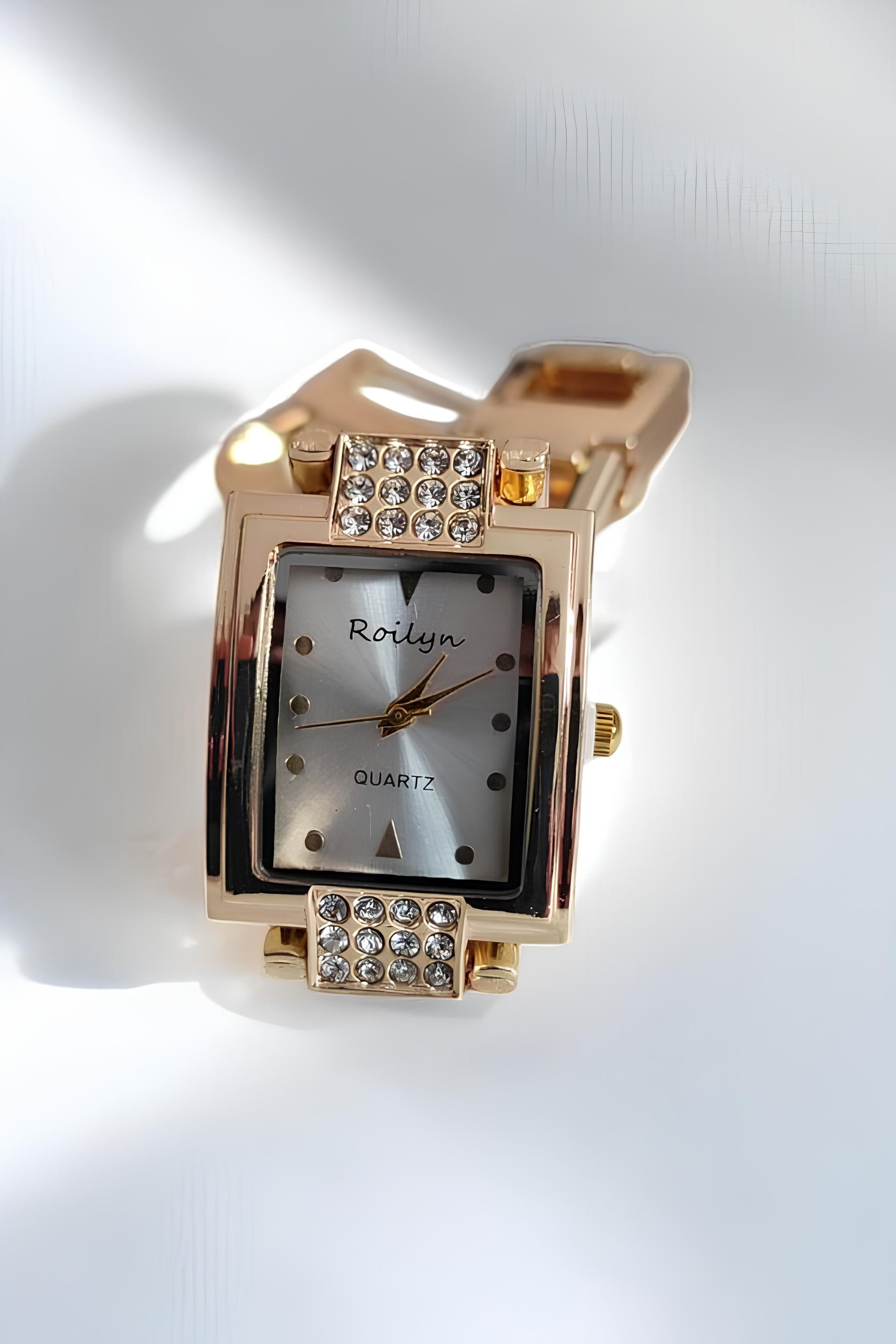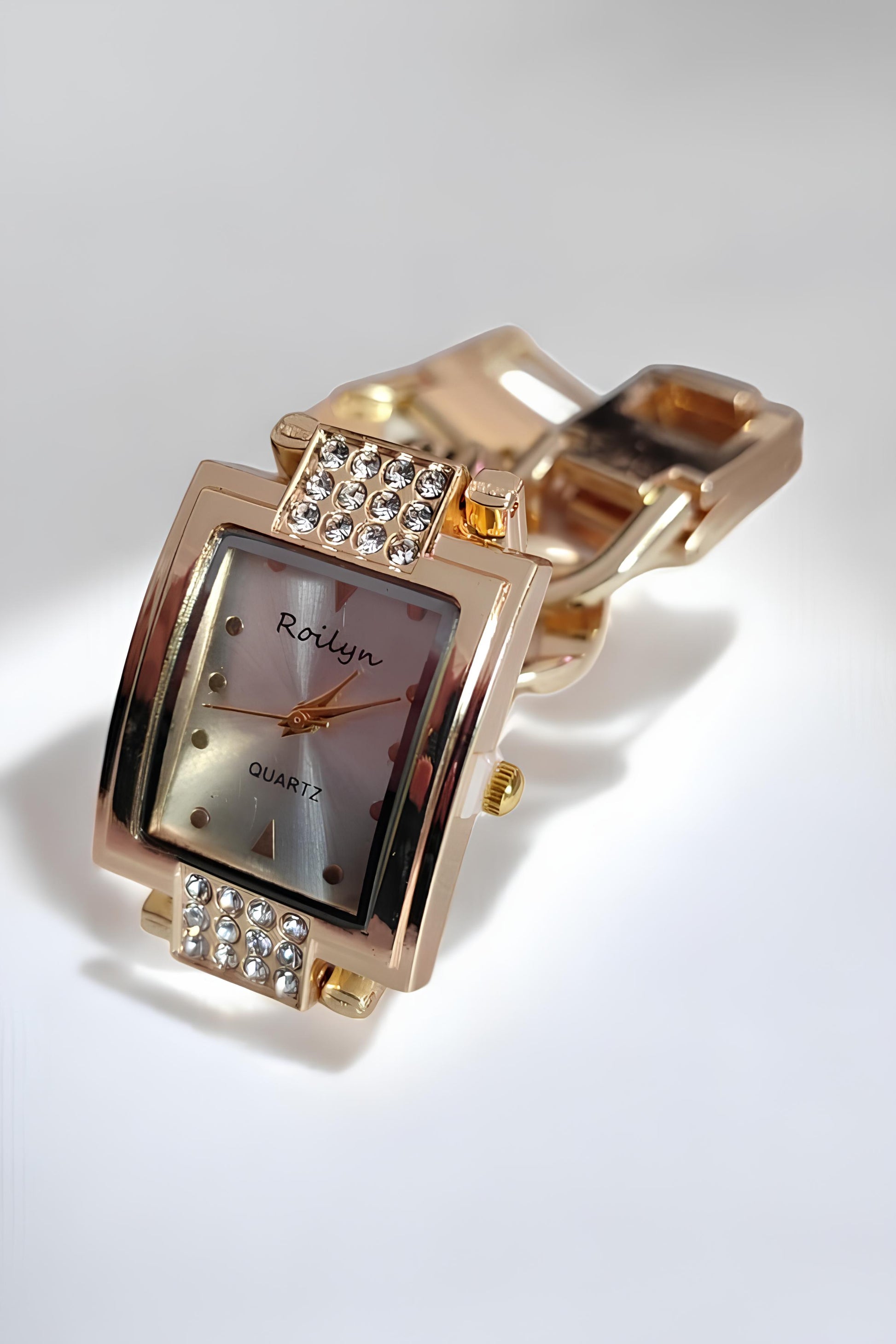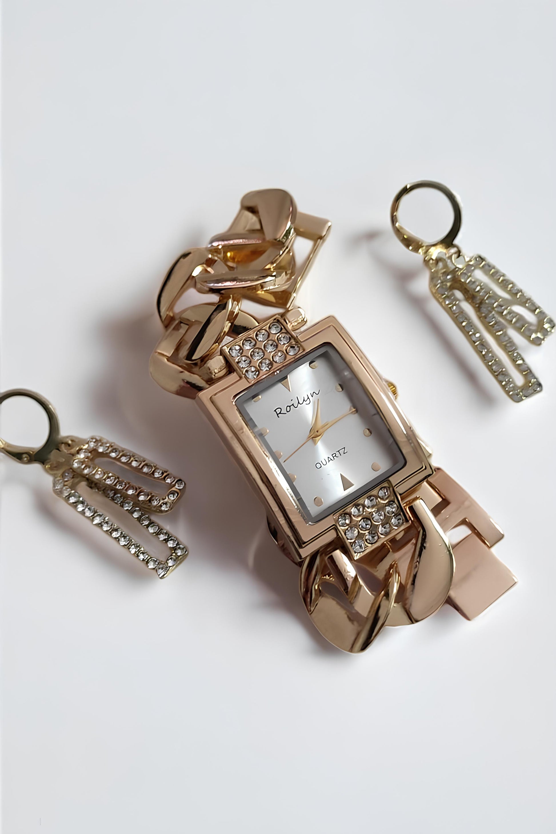 Şık Altın Renk Kadın Kol Saati ve Küpe Paslanmaz Çelik