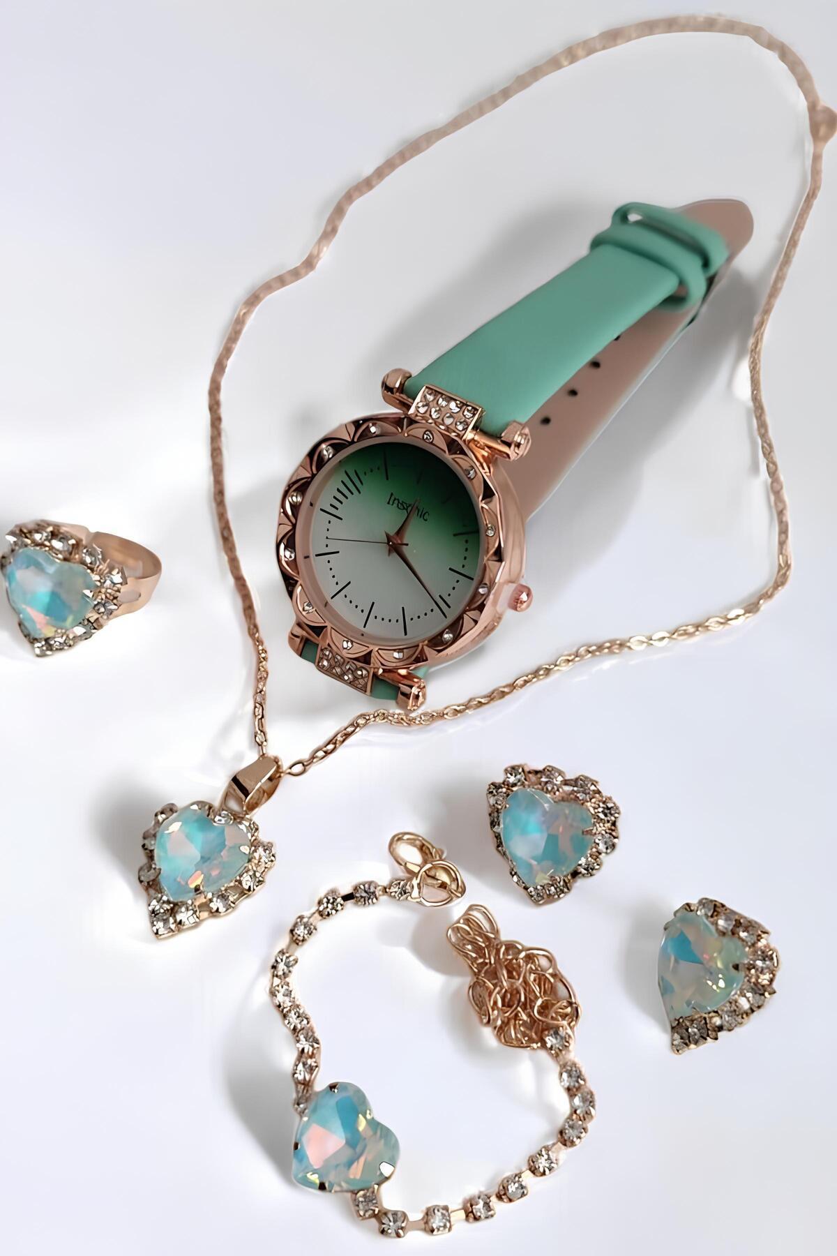 Yeşil Kayışlı Kadın Saat ve Takı Seti – Şık Kolye, Küpe, Yüzük, Saat ve Bileklik Kombini